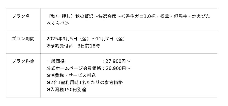 アイアンドエフ・ビルディング株式会社(本社:大阪市北区、代表取締役:泉 邦治)が運営するビナリオホテルズ&リゾーツの施設の1つ「山陰湯村温泉 湧泉(ゆうせん)の宿ゆあむ」(兵庫県)では秋の味覚<香住ガニ1.0杯・松茸・但馬牛・地えびたべくらべ>が愉しめる秋の贅沢/特選グルメプランを2025年9月5日(金)~11月7日(金)にご提供いたします。