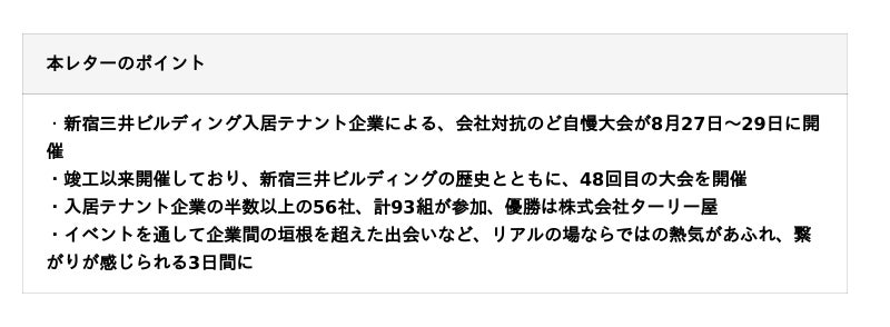 三井不動産株式会社(所在:東京都中央区、代表取締役社長:植田俊)は、8月27日(水)~29日(金)に「第48回新宿三井ビルディング 会社対抗 のど自慢大会」を開催しました。今年は56社、計93組が参加しました。3日間を通して参加者・応援団・観客が一体となって会場を盛り上げ、リアルな場ならではの熱の入ったハイレベルな戦いを繰り広げました。