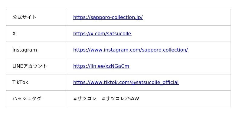 このたび、モデルとしてhanano、marimo、miku、moeri、yurie、lisa、runaの出演が決定いたしました。札幌を拠点に活動し、テレビやラジオ、イベントなどでも活躍する彼女たちが、サツコレのステージを華やかに彩ります。なお、lisaは『サツコレ2025SS』で実施されたモデルオーディションのグランプリ受賞者であり、今回のステージは記念すべき凱旋出演となります。