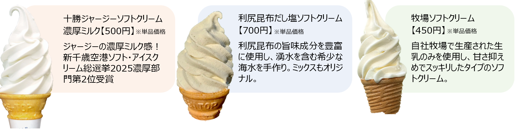 酪農王国北海道の新鮮な牛乳を使用したソフトクリーム7種からお好みの3種を食べ比べできるチャンス!