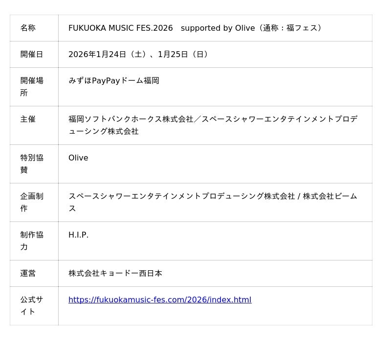 福岡ソフトバンクホークス株式会社とスペースシャワーエンタテインメントプロデューシング株式会社およびセレクトショップ「BEAMS」を展開する株式会社ビームスが共同でプロデュースする音楽フェス「FUKUOKA MUSIC FES.2026 supported by Olive(以下、福フェス)」の第1弾LIVE ACTとして5組の出演が決定しましたので、お知らせします。