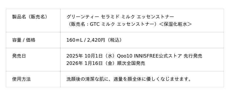 『グリーンティー セラミド ミルク エッセンストナー』を2025年10月1日(水)よりQoo10 INNISFREE公式ストアにて先行発売、2026年1月16日(金)より順次全国発売、 『グリーンティー セラミド バリア クリーム』を2025年10月1日(水)より順次全国発売いたします。