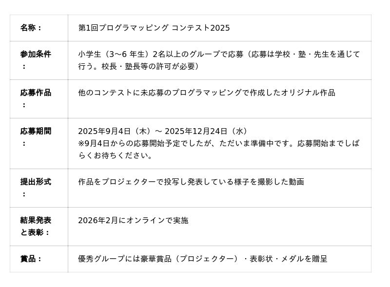 8月にアナウンスしていた小学生向け作品コンテスト「第1回プログラマッピング コンテスト2025」について、特設ページの内容を更新し、応募方法や、よくある質問(FAQ)などの詳細情報を公開しました。