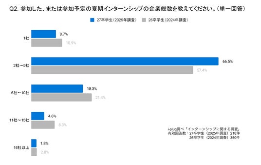Q2. (Q1にて「参加しない」と回答した方以外に伺います。)参加した、または参加予定の夏期インターンシップの企業総数を教えてください。(学生対象/単一回答)