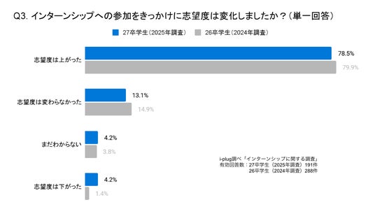 Q3.(Q1にて「すでに参加した」と回答した方に伺います。)インターンシップへの参加をきっかけに志望度は変化しましたか?(学生対象/単一回答)