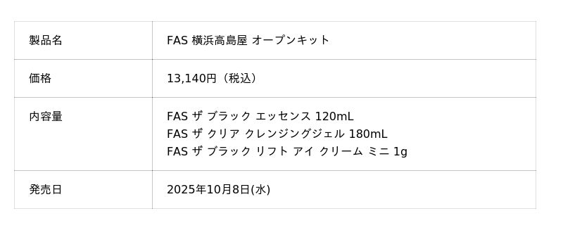株式会社シロク(本社:東京都渋谷区、代表取締役社長:飯塚勇太)が展開する発酵エイジングケア*¹ブランド「FAS(ファス)」は、2025年10月8日(水)より横浜高島屋に新店舗をオープンいたします。オープンを記念して、「FAS」の人気製品をお楽しみいただけるオープン記念キットとお買上げ特典をご用意しております。
