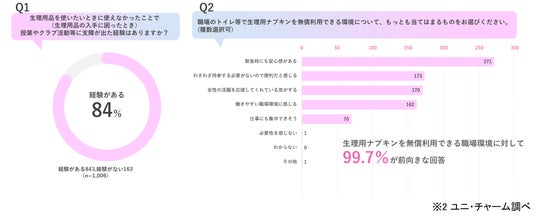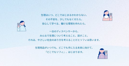 女性のウェルネスケアブランド『ソフィ』は、40年以上にわたり、女性の健康を支える商品やサービスを提供してきました。2019年からは、「#NoBagForMe」プロジェクトや公式TikTokアカウント「ソフィ さらけだ荘」などを通じて、生理について気兼ねなく話せる環境づくりを推進し、社会全体の理解促進に努めています。一方、“生理はいつ、どこでやってくるか分からないもの”で、学生の8割以上※2が外出先で生理用品を入手できずに生活に支障を感じた経験があることがわかっています。また職場においても、生理用品が常備されいつでも無償で利用できる環境に対してほぼすべての女性が「前向きに受け止めている」という結果※2も出ています。