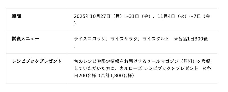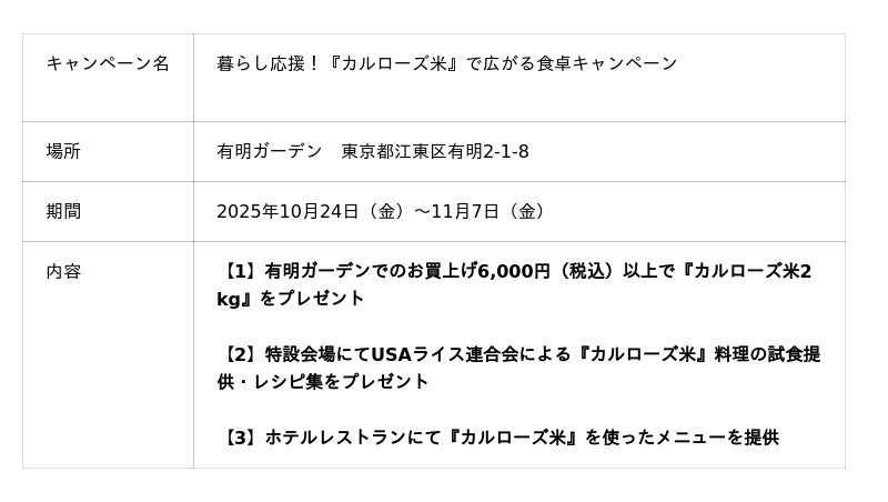 そして今年は、世界で高く評価される『カルローズ米』を、試食コーナー、飲食店メニュー、買い上げプレゼントキャンペーンを通じてご紹介します。商業施設として「食文化の今とこれからを体感できる場」を提供し、日本米との味わいや使い方の違いを体験していただくことで、日々の暮らしに新たな発見と選択肢を広げることを目指します。