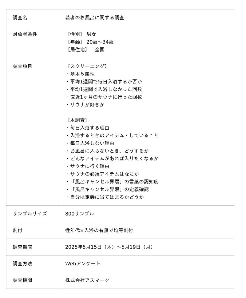 そこで今回は、こうした背景を踏まえ、若者の入浴やサウナ利用の実態に迫るためのアンケートを実施しました。本調査では、ご入浴状況やサウナの利用状況によって、「入浴をしなかった際に気になること」や「入浴をしない理由」にどのような傾向があるのかを明らかにし、若者のライフスタイルに潜む意識や価値観の一端を探っていきます。