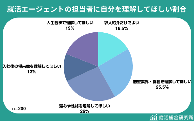 就活エージェントの担当者に自分をどの程度理解してほしいか尋ねたところ、就活生の26.0%が、就活エージェントの担当者に「強みや性格を理解してほしい」と回答しました。