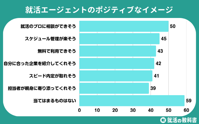 就活エージェントに対するポジティブな印象として、「就活のプロに相談ができそう」(50人)が最も多く、「スケジュール管理が楽そう」(45人)、「無料で利用できそう」(43人)が続きました。一方で、「当てはまるものはない」と答えた学生も59人で、エージェントの価値を十分に理解していない学生の存在も浮き彫りになりました。