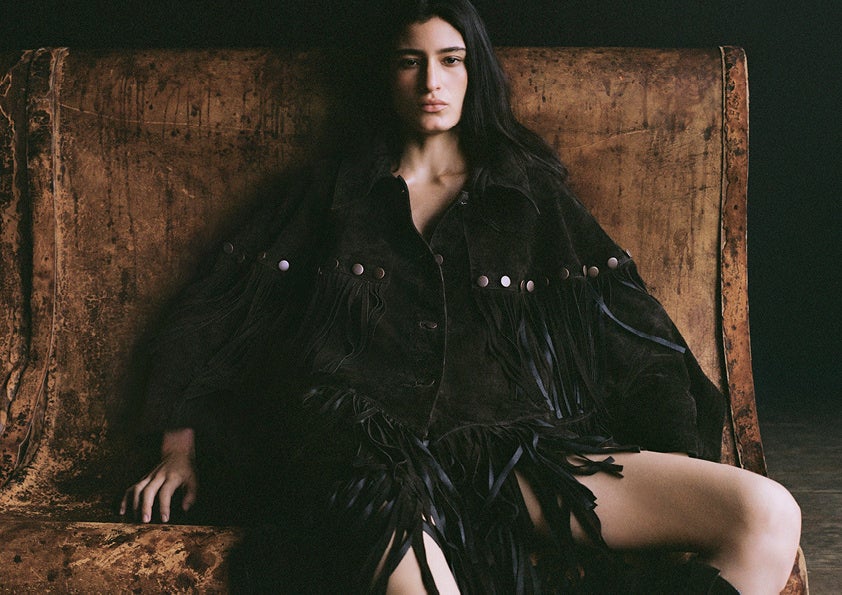 Lorena Saravia H&M:フリンジスエードケープジャケット ¥69,999、フリンジスエードスカート ¥49,999