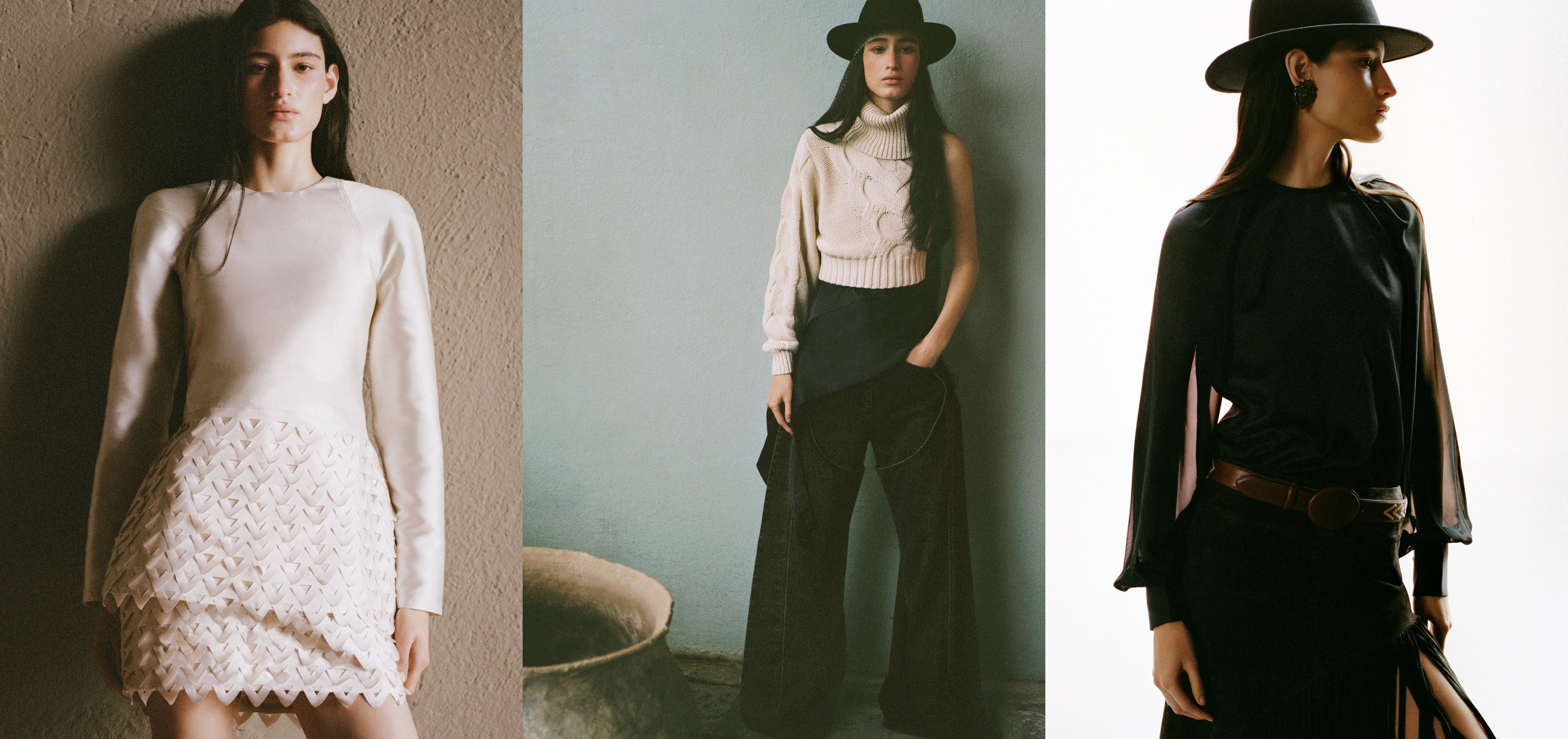 Lorena Saravia H&M:<左> カットアウトスカートワンピース ¥34,999 <中央> ウエスタンインスパイアド ウールハット ¥6,999、アシンメトリータートルネックセーター ¥9,999、アシンメトリー サテンホルターネックトップス ¥8,999、チャップスレイヤードパンツ ¥14,999 <右> ウエスタンインスパイアド ウールハット ¥6,999、ライオンピアス ¥3,999、オープンバックサテンブラウス ¥9,999、レザーベルト ¥9,999、フリンジスエードスカート ¥49,999