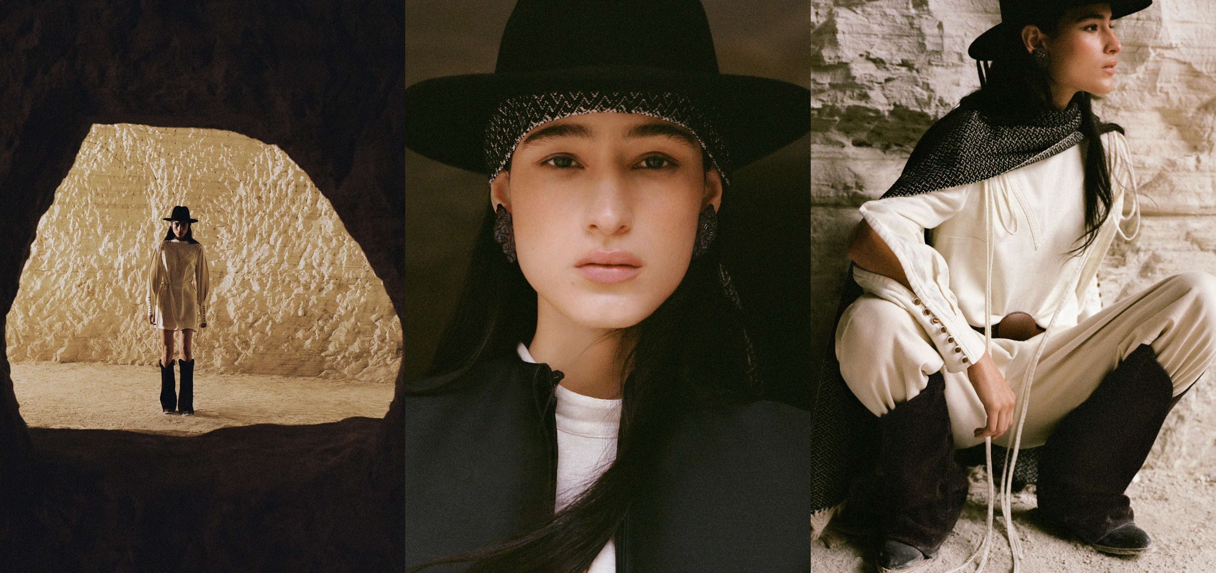Lorena Saravia H&M:<左> ウエスタンインスパイアド ウールハット ¥6,999、リネンブレンドワンピース ¥12,999、ウエスタンインスパイアド スエードブーツ ¥29,999 <中央> ウエスタンインスパイアド ウールハット ¥6,999、ライオンピアス ¥3,999 <右> ウエスタンインスパイアド ウールハット ¥6,999、フリンジコットンショール ¥8,999、リネンブレンドブラウス ¥9,999、フロントプリーツツイルパンツ ¥9,999、ウエスタンインスパイアド スエードブーツ ¥29,999