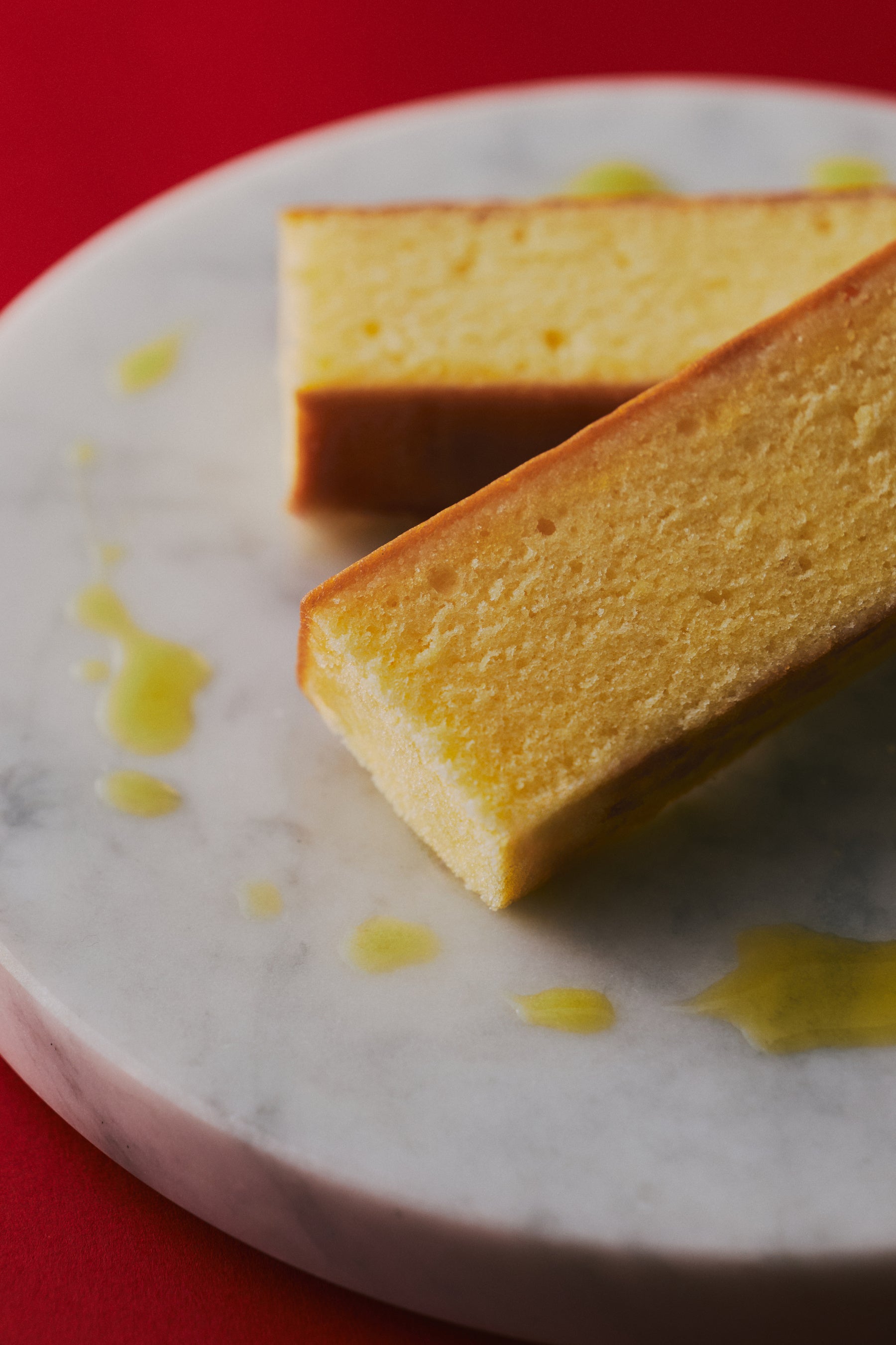 【ガトーオリーブ】、岡山蒜山のジャージー牛乳のバターとメゾンドアイビーのハチミツ、さらにオリーブオイルをふんだんに使用しています。カステラのような見た目ながら、口に入れた瞬間にオリーブオイルの深い味わいが広がります。ワインとの相性も良く、特別な夜を彩ります。