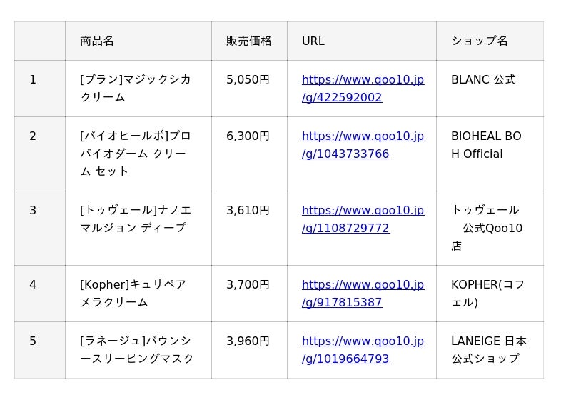 Qoo10(https://www.qoo10.jp/)サイト上、「乳液・クリーム」「リップメイク」「アイシャドウ」「チーク」カテゴリーの公式ショップ各販売個数に基づいたランキングです。