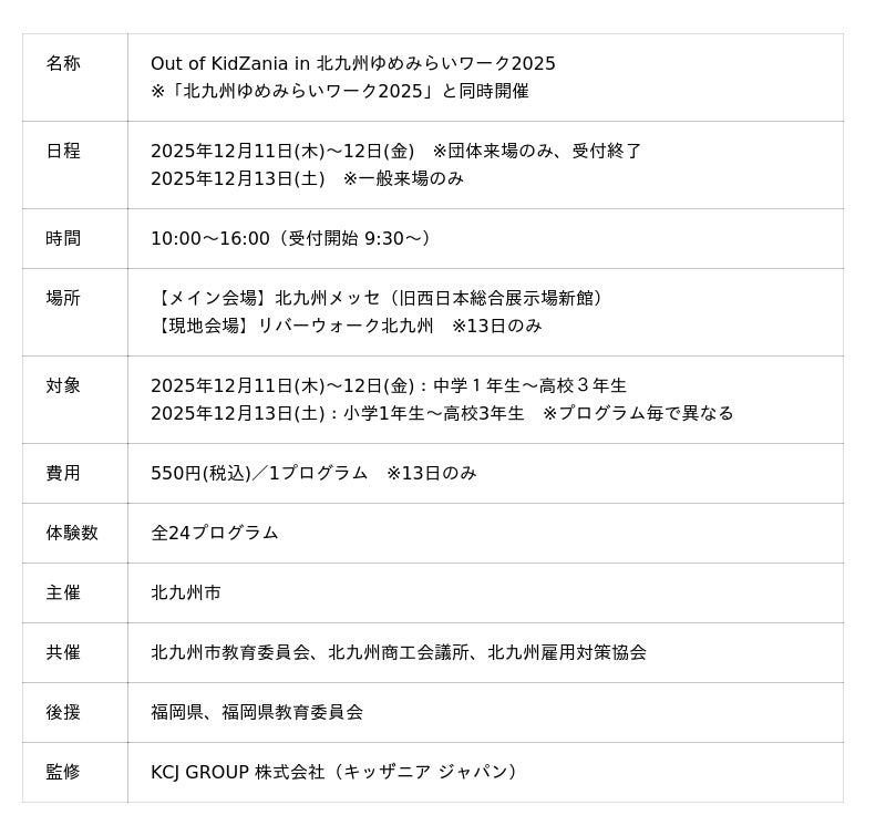北九州市では、こどもの職業・社会体験施設「キッザニア」の企画・運営を行うKCJ GROUP 株式会社による監修のもと、小学生から高校生を対象に、キッザニアの街を飛び出して実社会の仕事を体験できるプログラム「Out of KidZania in 北九州ゆめみらいワーク2025(以下 本イベント)」を開催いたします。