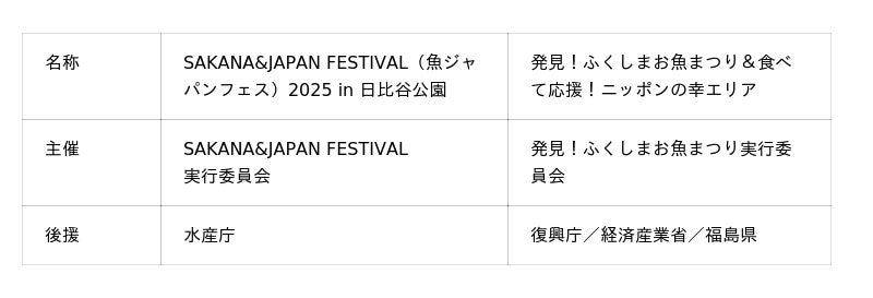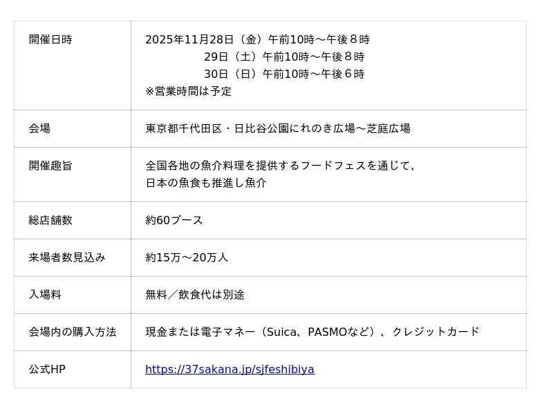 全国各地の魚介グルメが味わえる「SAKANA&JAPAN FESTIVAL(魚ジャパンフェス)2025 in 日比谷公園」(主催・SAKANA&JAPAN FESTIVAL実行委員会)が2025年11月28日(金)~30日(日)の3日間、東京都千代田区の日比谷公園で開催されます。魚ジャパンフェスは、四方を海に囲まれた日本の大切な食文化で、栄養豊富な「魚食」の活性化を目的に開催している、累計来場者数が250万人に上る日本最大級の魚介グルメフェスティバルです。