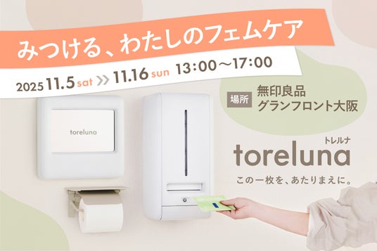 株式会社ネクイノ(大阪市北区、代表:石井 健一)が展開する、トイレの個室で生理用ナプキンを常備し無料で提供するサービス「toreluna(トレルナ)」(以下 トレルナ)は、2025年11月15日(土)・16日(日)に、「無印良品 グランフロント大阪」(大阪市北区)で開催される、株式会社良品計画主催のイベント『みつける、わたしのフェムケア』に出展いたします。本イベントは、月経やからだの変化について知り、より快適に過ごすためのヒントを得られる場として開催されます。