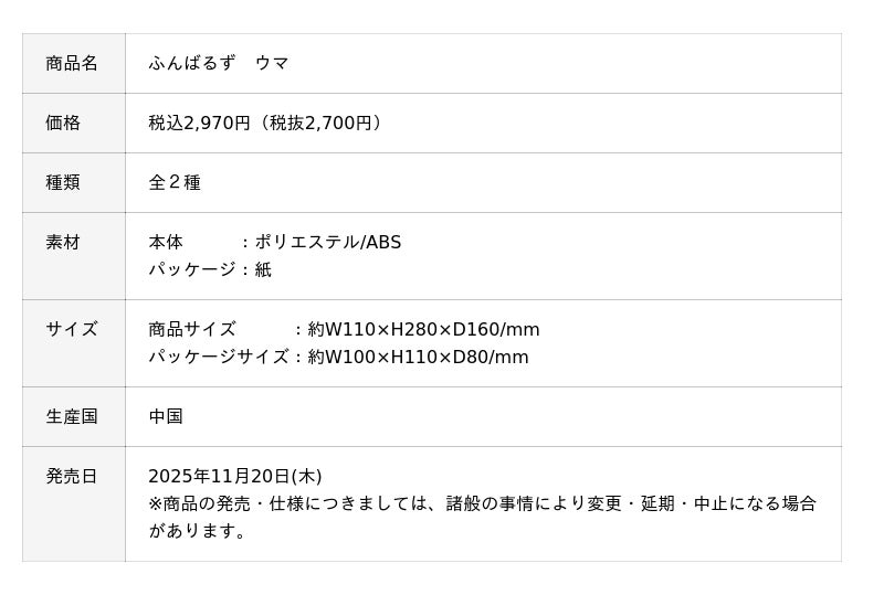 株式会社ドリームズ(本社:東京都新宿区/代表取締役 添谷徹)は、 “猫背”なあなたを支えるぬいぐるみ「ふんばるず」より『ふんばるず ウマ』を、2025年11月20日(木)に発売します。SNSで大人気の“猫背”なあなたを支えるぬいぐるみ「ふんばるず」に、2026年の干支である“ウマ”が新登場。「ふんばるず」は、机とおなかの間に挟むことで “猫背”なあなたを助けてくれるぬいぐるみです。『ふんばるず ウマ』と美姿勢で迎える2026年は、行動力に満ち溢れ、大きく前進する1年になること間違いなし。ドリームズオンラインショップでは、2025年11月11日(火)より先行予約を開始します。『ふんばるず ウマ(ホワイト)』は、ドリームズオンラインショップ限定で販売します。