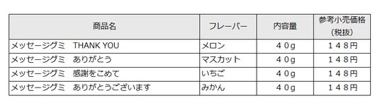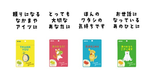 カネカ食品は、これまで培ってきた食品づくりの知見をベースにしながら、「ありがとう」「感謝をこめて」など、渡す相手に合わせて選べる感謝の気持ちを込めたお菓子を提案します。プチギフトやちょっとしたプレゼントとして贈るのはもちろん、自分自身へのご褒美としても楽しめるグミ商品です。