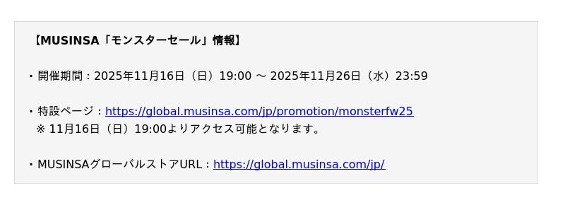 アジア最大級のファッションプラットフォームMUSINSA(ムシンサ)は、今年最大規模のセールキャンペーン「MONSTER SALE(モンスターセール)」を11月16日(日)19時から11月26日(水)23時59分まで開催します。