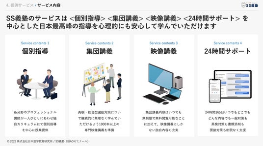 株式会社日本進学教育研究所(Japan Institute for Further Education, Inc.)は、3ブランドの学習塾を運営、合計受講者数は3万3千人超。2014年名古屋にて創業。利益重視志向の教育業界の在り方に一石を投じるべく、顧客第一主義を掲げ『AOゼミナール』を全国展開。後に『SS義塾』『PlusCAMP』『SS Plus』などの学習塾・予備校事業を同時複数展開。2024年にサービス10周年を迎え、新設法人でのリブランディングを実施。 誰もが見たことのない最高の教育サービスを通じて「人生が変わる、社会が変わる。」という理念をもとに教育事業・公共公益事業を中心としてソーシャルビジネスを展開。