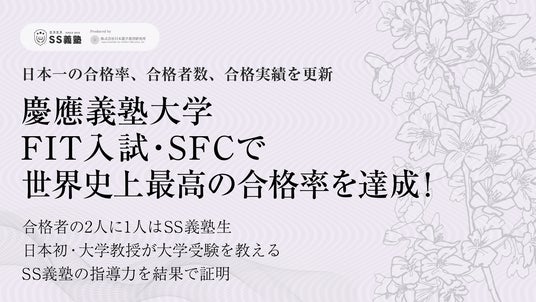 業界最大手予備校グループの傘下であり、総合型(旧AO入試)/推薦入試マーケットで国内トップシェアを誇る専門予備校「SS義塾」を運営する株式会社日本進学教育研究所(本社:東京都港区北青山/代表取締役HDグループCEO 苗田岳史)は、2025年度 慶應義塾大学総合型選抜において、法学部FIT入試79名、SFC122名の合格を達成しました。いずれも合格率・占有率・合格者数のすべてで全国第1位となり、創立以来の最高実績を樹立しました。