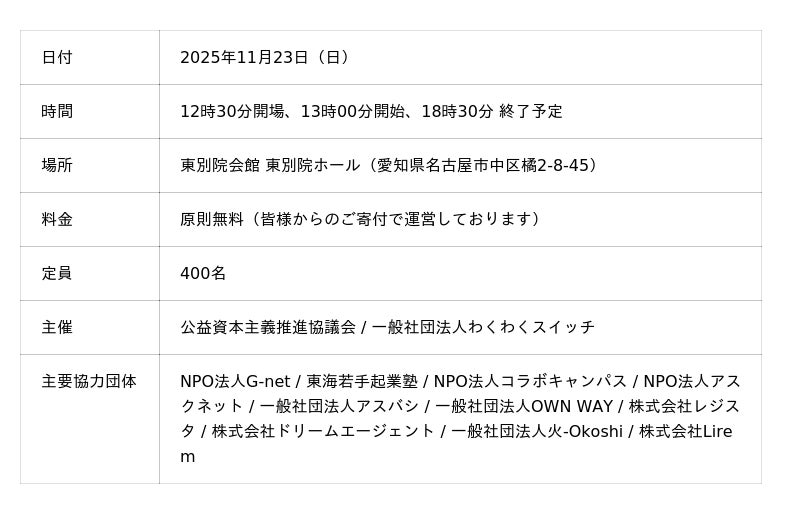 東海学生AWARDは、一般社団法人公益資本主義推進協議会(所在地:東京都渋谷区、代表理事:大久保 秀夫、以下PICC)が主宰するマイコミュニティフォーラムという活動の一環で開催されています。PICCと一般社団法人わくわくスイッチ(所在地:三重県四日市市、代表理事:中村憲和)とが協働し、東海地方を拠点に活動するNPOや教育関係者と連携しながら、寄付とボランティアによって運営されています。