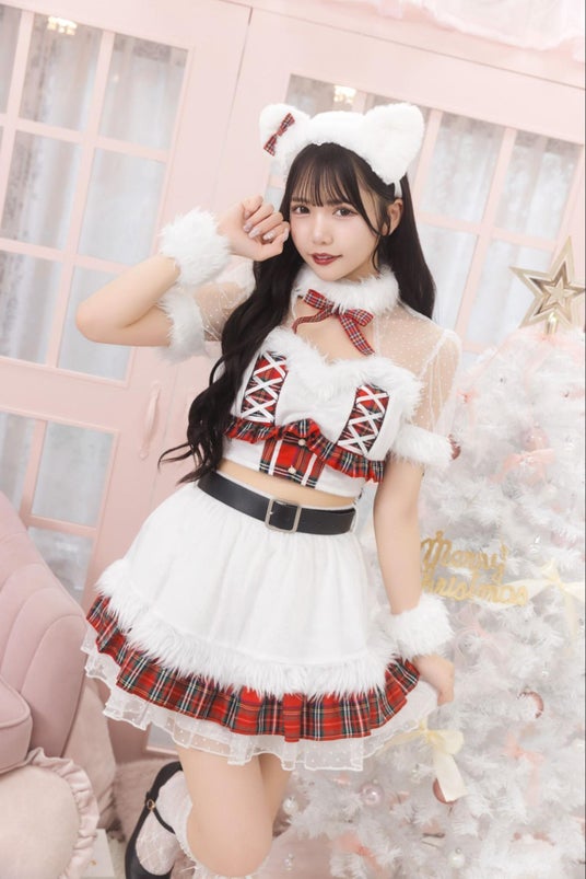 パフスリーブのショートボレロと、ふんわりと垂れるチュールスカートがアイドルチックな王道サンタ。裾のチュールにはハート柄のドットをあしらい、写真映えする細部まで徹底的にキュートにこだわりました。