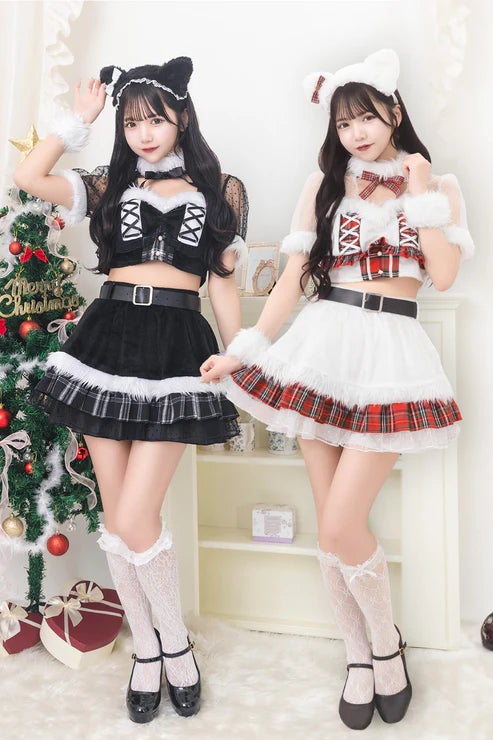 人気の「ルナキャット」から色違いが登場。黒猫はモノトーンのチェックとドットチュールでシックで大人っぽく。白猫はクリスマスらしいチェック柄とドット柄チュールでポップな印象に。どちらもコーディネートの幅が広がるキャットコスチュームです。