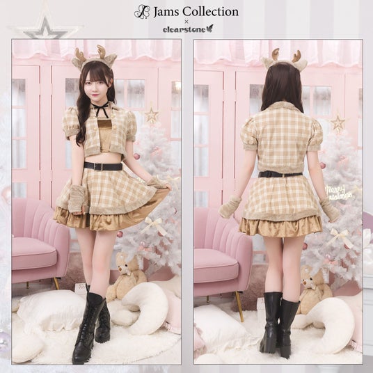 まるで甘くとろけるようなクリーミーなブラウンのトナカイコスチューム。チョーカーとベルトのブラックが全体を引き締め、メリハリのあるスタイルを演出します。定番のトナカイもリリパレらしいガーリーな仕上がりです。
