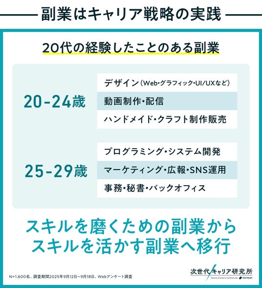 20代前半は“スキルを磨く”、後半は“スキルを活かす”段階へとシフトしており、副業がキャリア形成の実験と実践のサイクルとして機能していることが分かります。