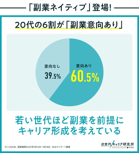 副業に「意向あり」と回答した割合は、20代が60.5%で全世代中トップでした。