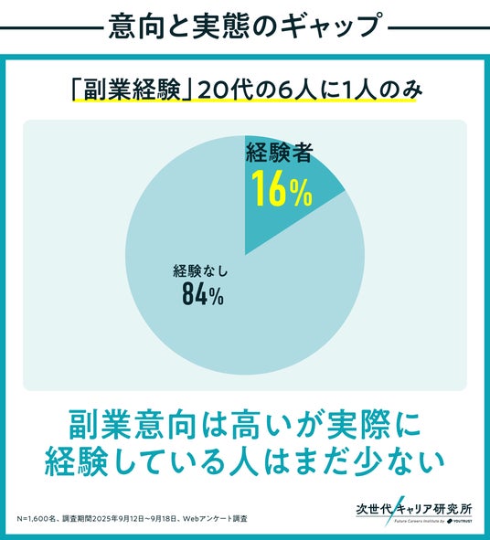 しかし、”副業ネイティブ世代”である20代の副業経験はいまだ6人に1人であり、意向と実際の行動にはギャップがあります。