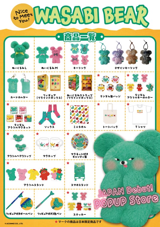 株式会社テレビ東京コミュニケーションズ(本社:東京都港区、代表取締役社長:福田一平、以下TXCOM)は、韓国のZ世代に人気のキャラクター『WASABI BEAR(ワサビベア)』の国内初となる期間限定POPUP Storeを、2025年12月3日より東京・大阪・横浜・博多の4都市で開催することをお知らせいたします。