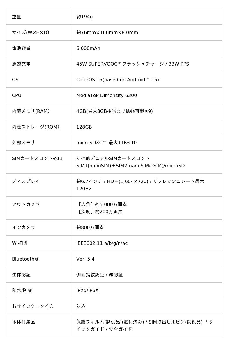 日本で販売を開始して以来、機能・性能と価格のバランスで幅広い世代からご好評をいただいている「OPPO Aシリーズ」。この度、販売される最新機「OPPO A5 5G」は、エントリーモデルながら、OPPO AIによる便利で高精度な写真編集※1を手軽に体験頂けます。6,000mAhの大容量バッテリーは、45W SUPERVOOC(TM)急速充電※2に対応し、さらに他機器へ給電できるリバースチャージ機能も搭載。約6.7インチの大画面は、最大1,000nitの高輝度で屋外でも見やすく、最大120Hzのリフレッシュレート※3で滑らかに操作できます。日常に便利なおサイフケータイ(R)機能や、手袋をしたまま操作できる手袋モードも備え、幅広い世代の方に快適にお使いいただける一台です。