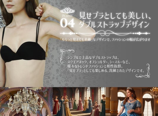 機能性だけでなく、ファッションアイテムとしての美しさも追求しました。 華奢で洗練された**「ダブルストラップ」**は、肩周りを繊細に彩ります。スクエアネックやオフショルダー、シースルートップスからあえて覗かせることで、コーディネートのアクセントに。下着の枠を超え、アクセサリー感覚で楽しめるデザインです。