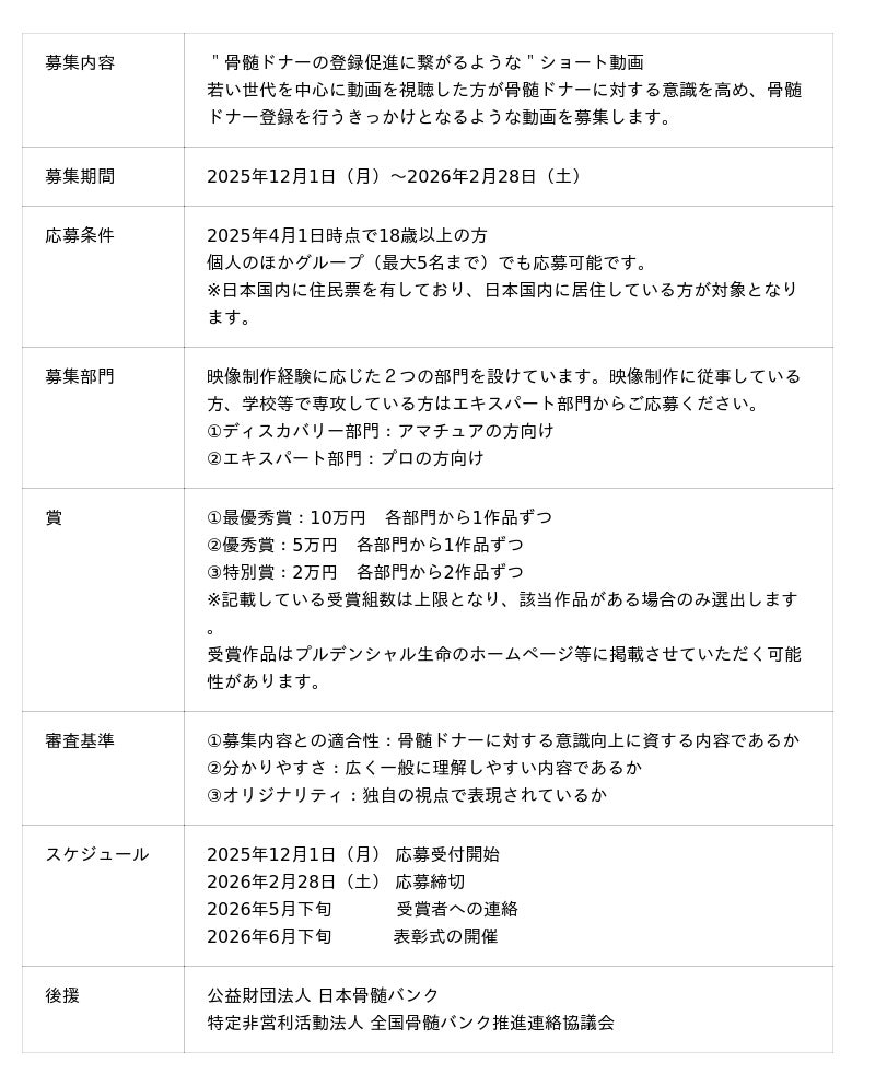 プルデンシャル生命保険株式会社(代表取締役社長 間原 寛、以下「当社」) は、動画コンテスト「プルデンシャル・ビデオ・クリエイション・アワード」を開催します。本コンテストは、若い世代の骨髄ドナー登録促進を目的に行い、2025年12月1日(月)より専用サイトにて募集を開始します。