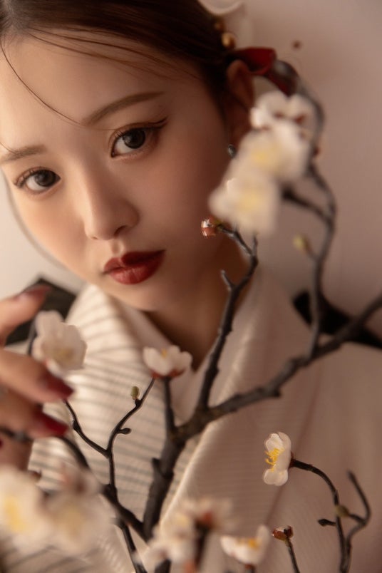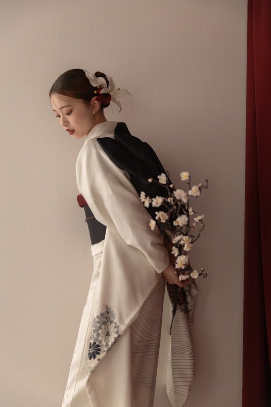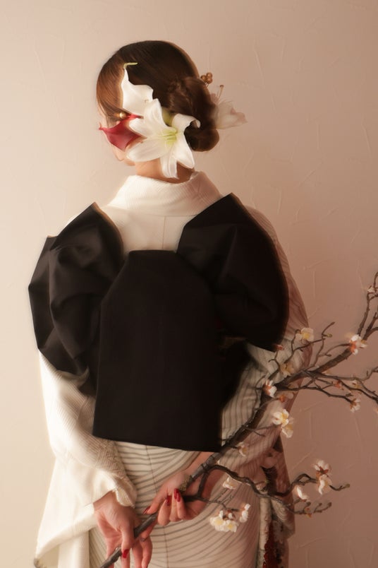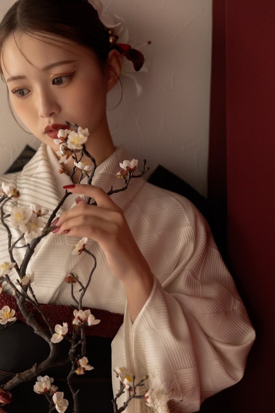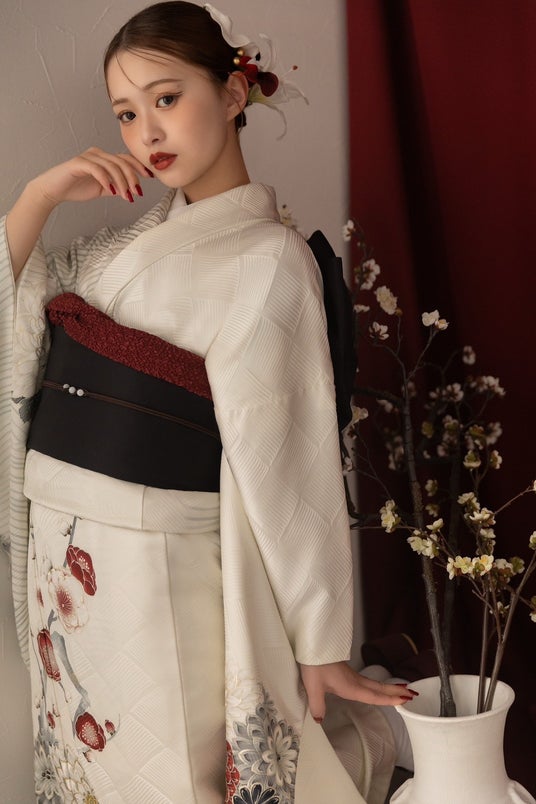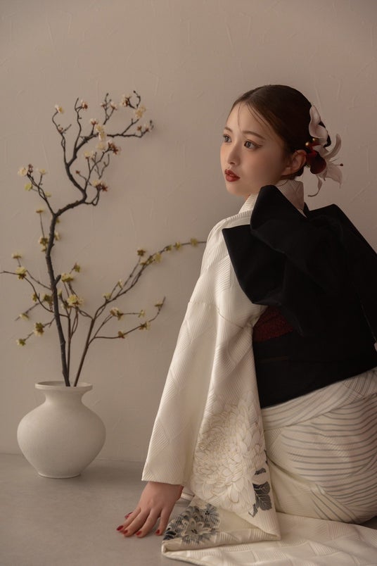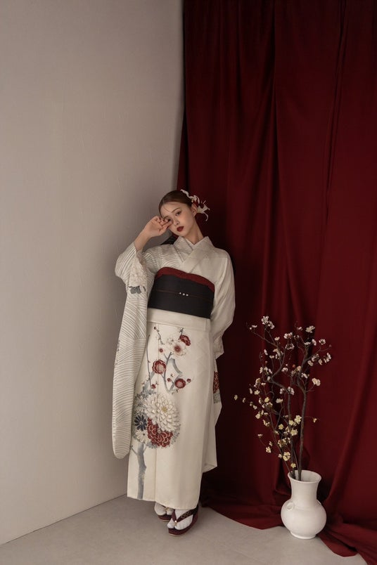 伝統的な和装の美しさを現代的な感性で再解釈した、白と深紅のコントラストが美しい