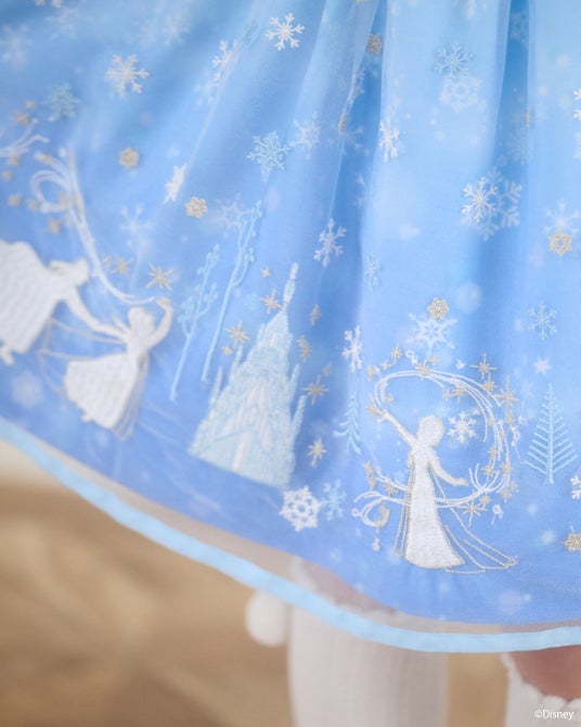 スカート部分や胸元には、雪やキャラクターのモチーフを刺しゅうで表現しました。