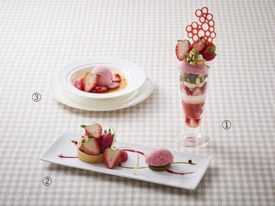 B1F 中国料理「桂花苑」では、「いちごとピスタチオのチャイニーズアフタヌーンティー」を、1F シェフズダイニング「シンフォニー」ならびにロビーラウンジ「フォンテーヌ」では、「いちごと抹茶のデザートフェア」を、1F スイーツ&ベーカリー「粋」では、「ストロベリースイーツ&パン」を発売いたします。