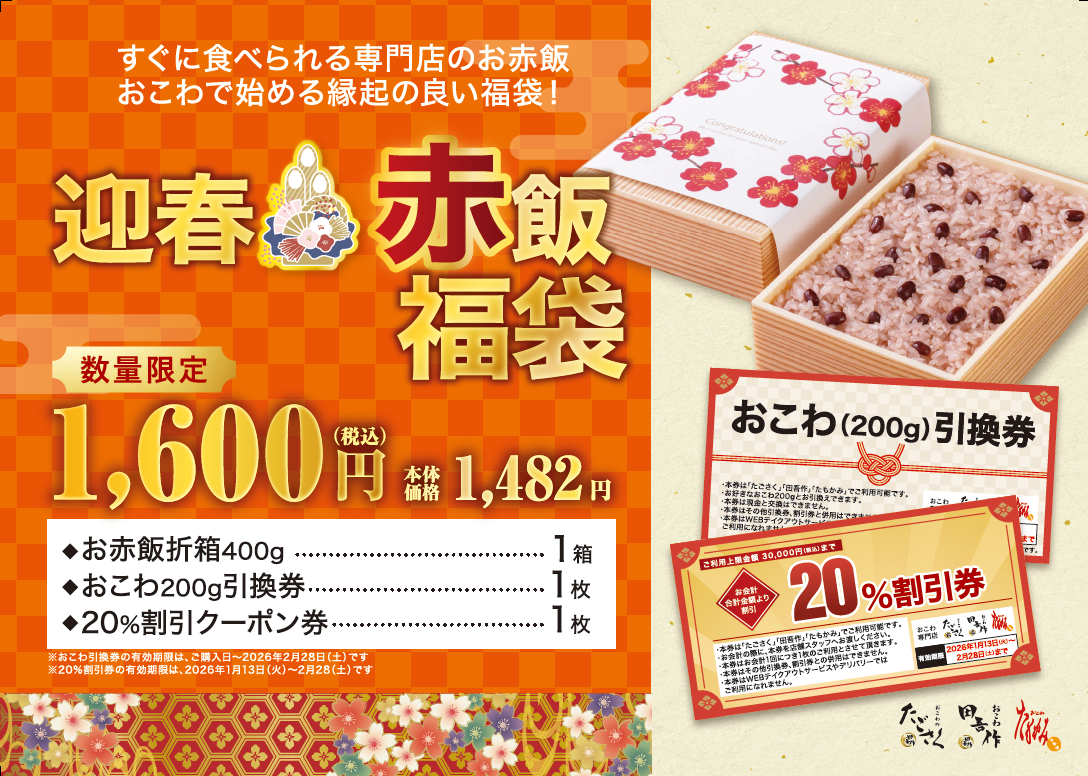 株式会社グリーンハウスフーズが展開するおこわ専門店「たごさく」「たもかみ」では、日ごろの感謝の気持ちを込め、全国の店舗にて、お得な福袋を2026年1月1日(木)から数量限定で販売いたします。