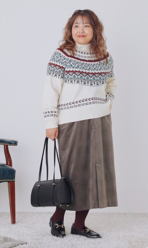 多色使いのフェアアイル柄が華やかな、1枚で決まるハイネックニット。ふんわりとした編地とシルエットで温かみがあり、冬の着こなしを優しく彩ります。ボトムはストレートシルエットのスカートで縦長ラインに。クリスマスシーズンにもおすすめの、気分が明るくなるコーディネートです。