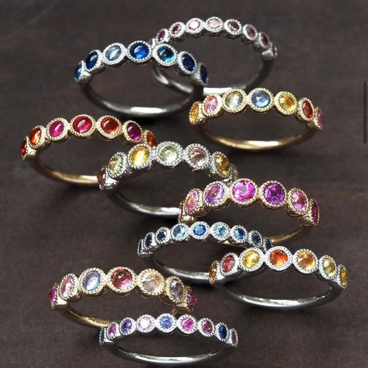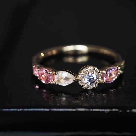 「サンクルール」は、“100の色彩”を意味するシリーズ。さまざまな形や色を持つ宝石を一本のリングに配し、まるで宝石箱のような世界観を表現したコレクションです。