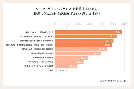 最後に、ワーク・ライフ・バランスを推進するために職場にどのような支援があるとよいか尋ねたところ、「有休・リフレッシュ休暇の取りやすさ」が57.5%、「柔軟な勤務制度(リモートワーク・フレックスなど)」が53.1%となりました。休暇制度や勤務制度の整備を求める声が多い一方で、「妊娠・出産・育児との両立支援制度の充実」が50.4%、「生理・PMS・更年期など健康課題への支援(休暇・相談など)」が49.1%となり、制度面とあわせて女性特有の健康面でのサポートを求めるニーズも高いことがわかりました。