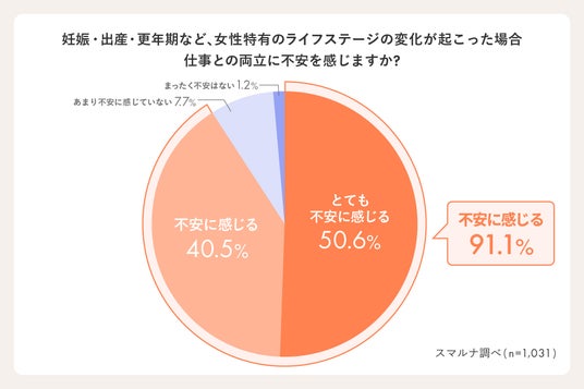 一方で、妊娠や出産、更年期などライフステージの変化にともなう働き方への不安を尋ねたところ、91.1%が「不安に感じる」と回答し、9割を超えました。特に若い世代では「とても不安」と回答する割合が高く、将来的な働き方に対して不安を抱く人が多い傾向が見られました。