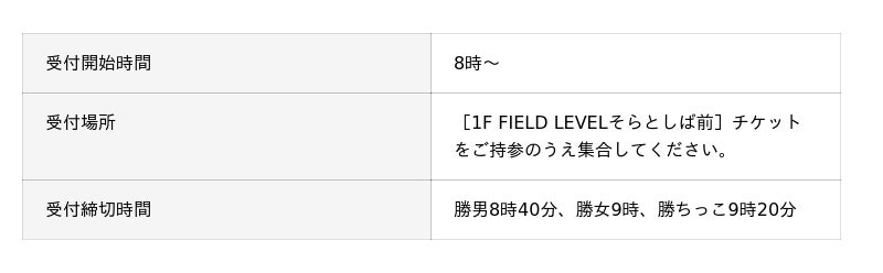 受付後、親御様は外野エリアでご観覧ください。レース終了後、「受付時のそらとしば前」にてお子様をお引き渡しします。