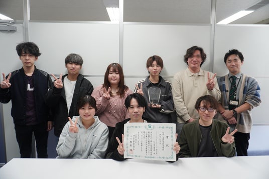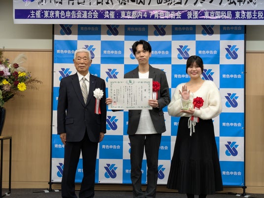 11月7日には、東京青色申告会館にて表彰式も開催されました。チームを代表してCG学科の上釜くんと、声優学科の太田さんが出席し、表彰状、クリスタルトロフィー、賞金10万円が授与されました。