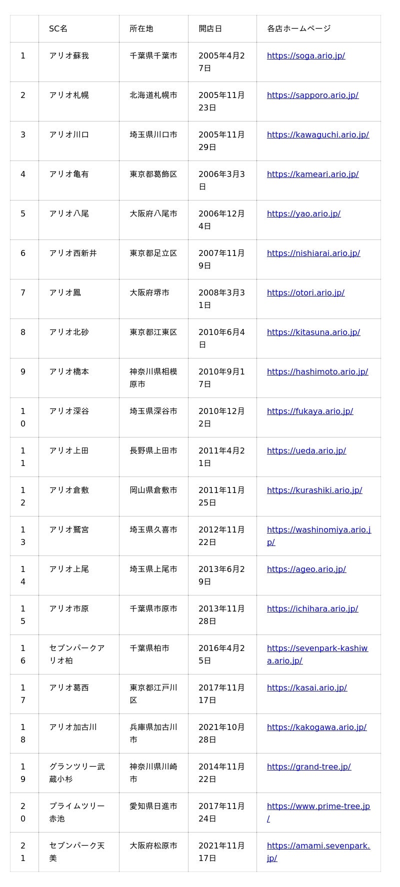 アリオ市原 アリオ札幌 アリオ八尾 アリオ鳳 アリオ加古川 アリオ上田